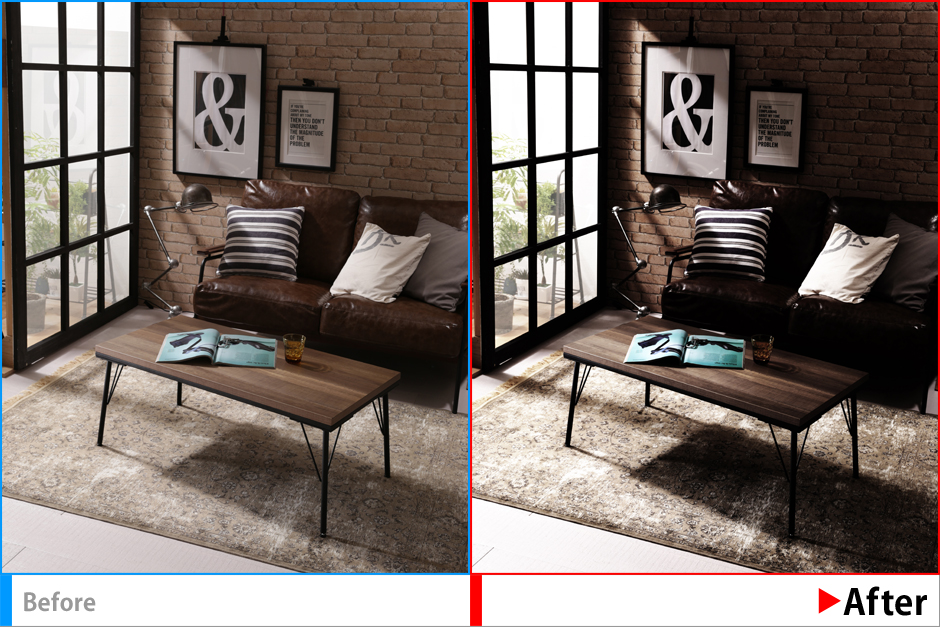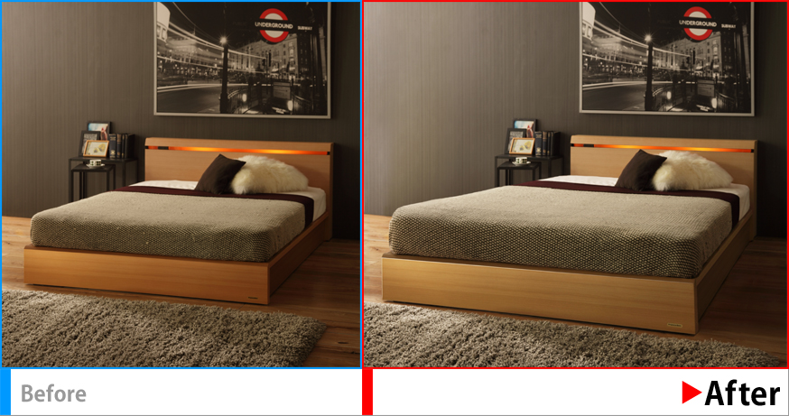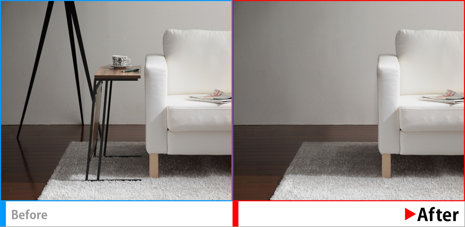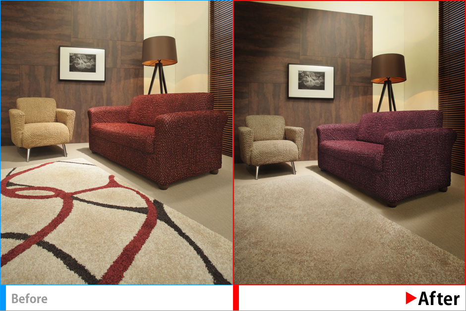 商品ではないカーペットの柄の印象が強すぎるので消去~全体を整えた後、仕上げとして商品(ソファ)に視線が誘導されるよう光を調節、商品にスポットが落ちるように演出。
