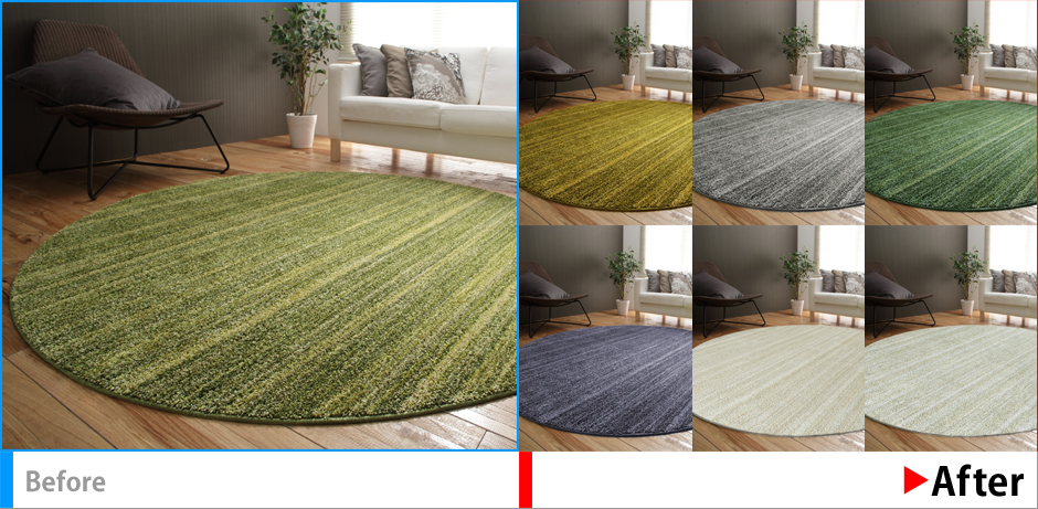 実際の商品と印象が異ならないように質感を大事にしつつ別カラーに色変換。本体色変換後のナチュラルカラーが引き立つよう、下に敷いてあるラグもグリーンに色変換。