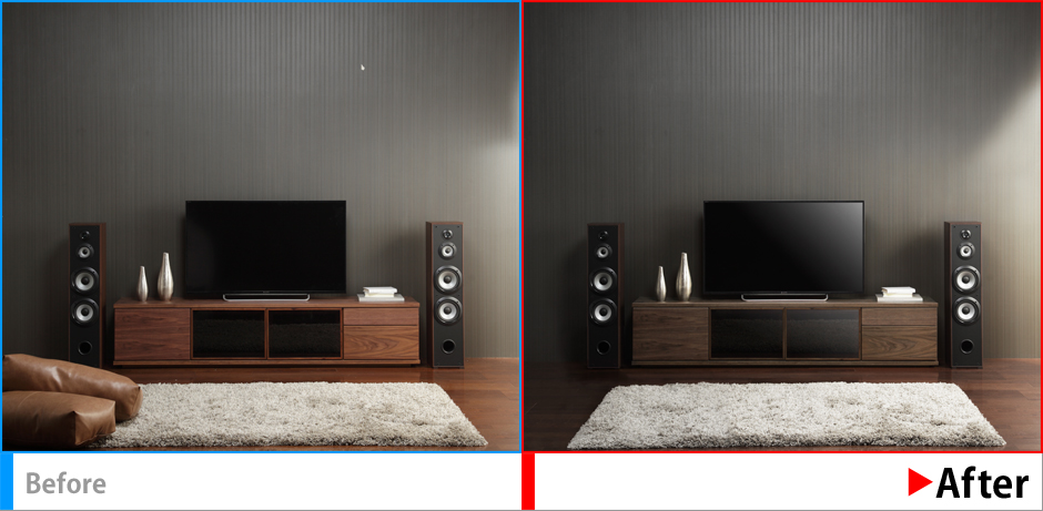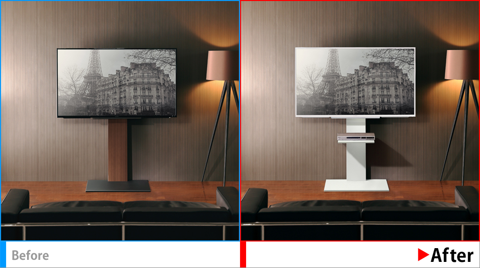 商品(TV台)カラーを白に変更したいとの要望に応えつつ、影の落ち方などできるかぎり自然な印象になるよう仕上げる。