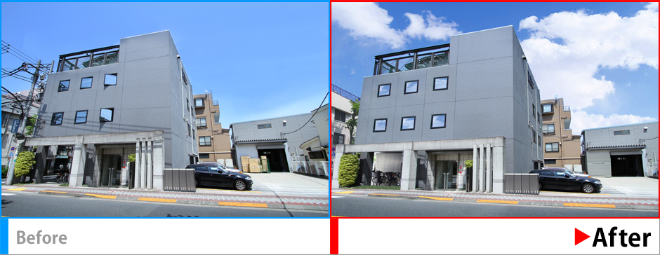 電線等の不要物の除去、開いている窓を閉める、背景画像の差替え合成などで建物の印象が主役になるように演出。