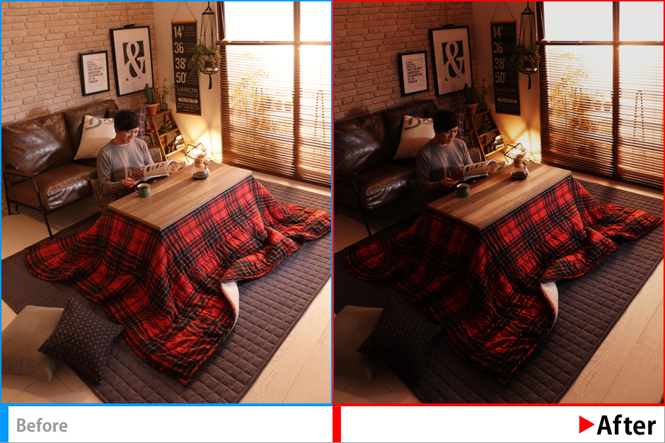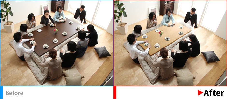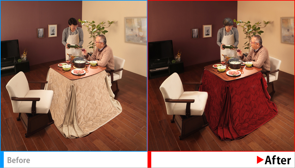 違和感の残らないよう人物の消去、こたつのサイズ変更、色変換を行う。