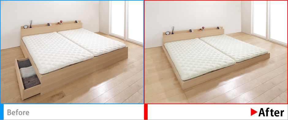 「引出し付きベッド」を違和感のないように「引出し無しのロータイプ」に変更。フローリング部分に合成や加工の後を残さないように。