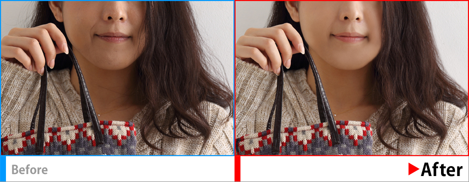 自然な商品カラーの変更、また中年女性を初老程度の印象に画像加工。またコントラストや色味を調整して全体的に暖かい印象になるように演出。