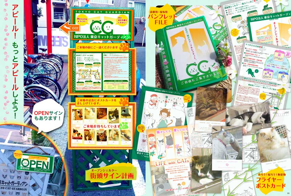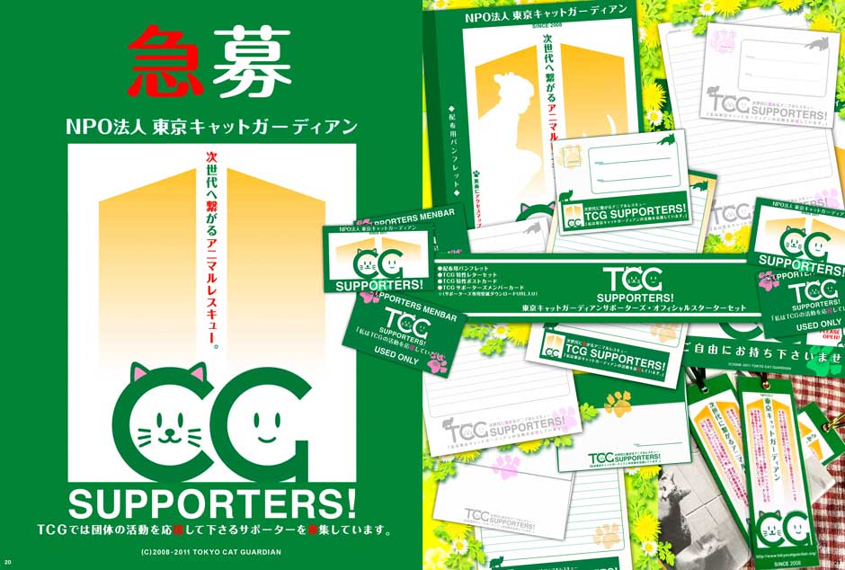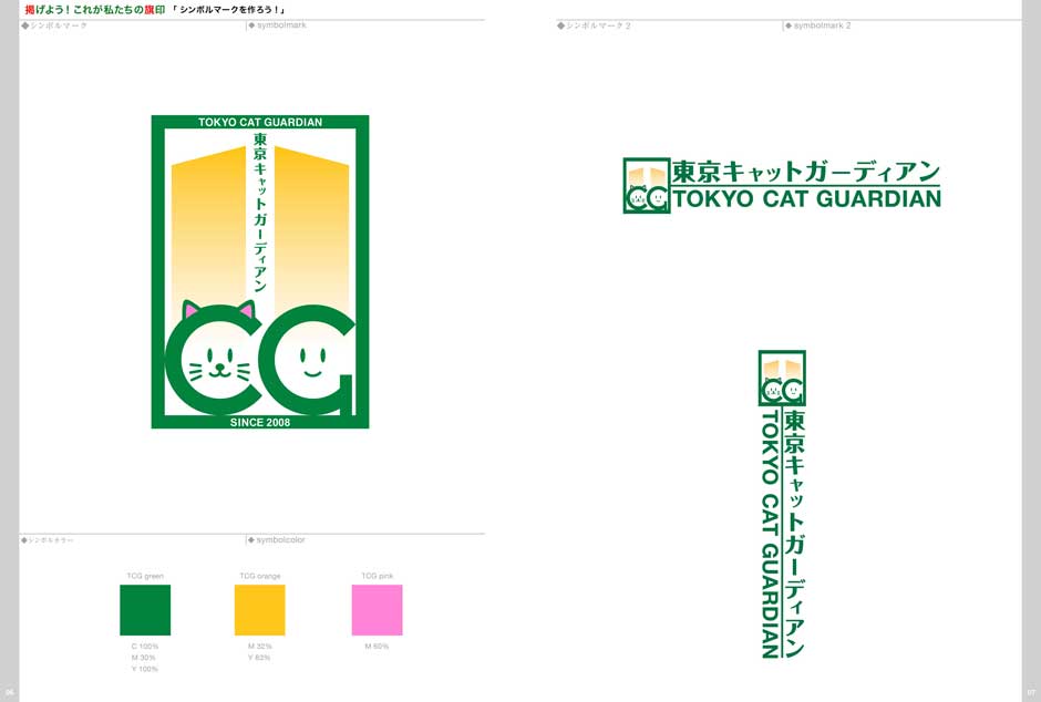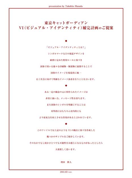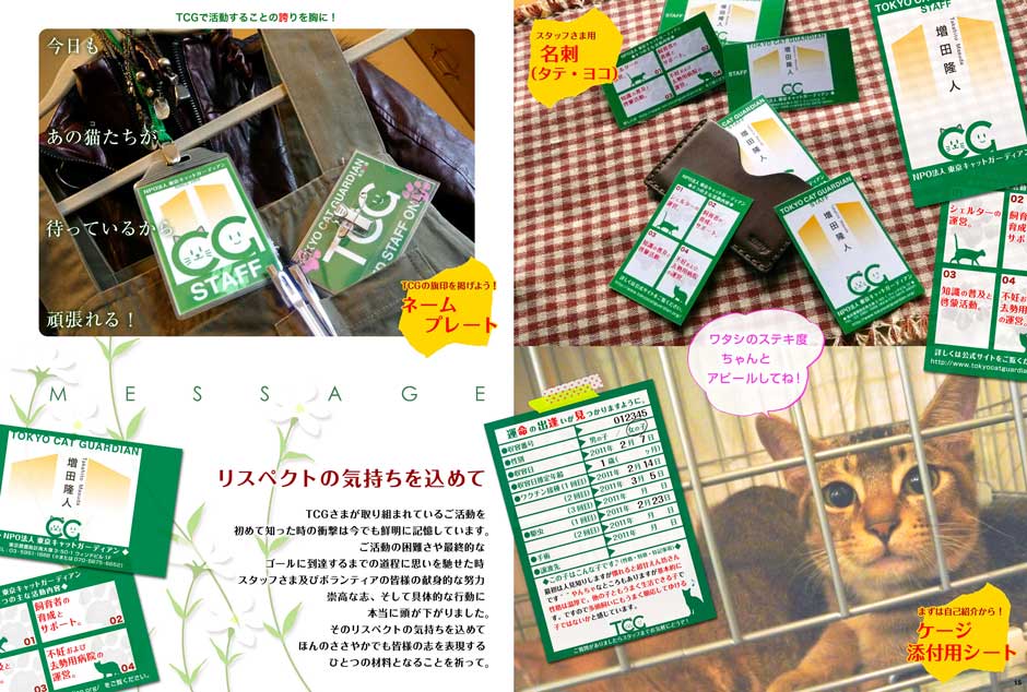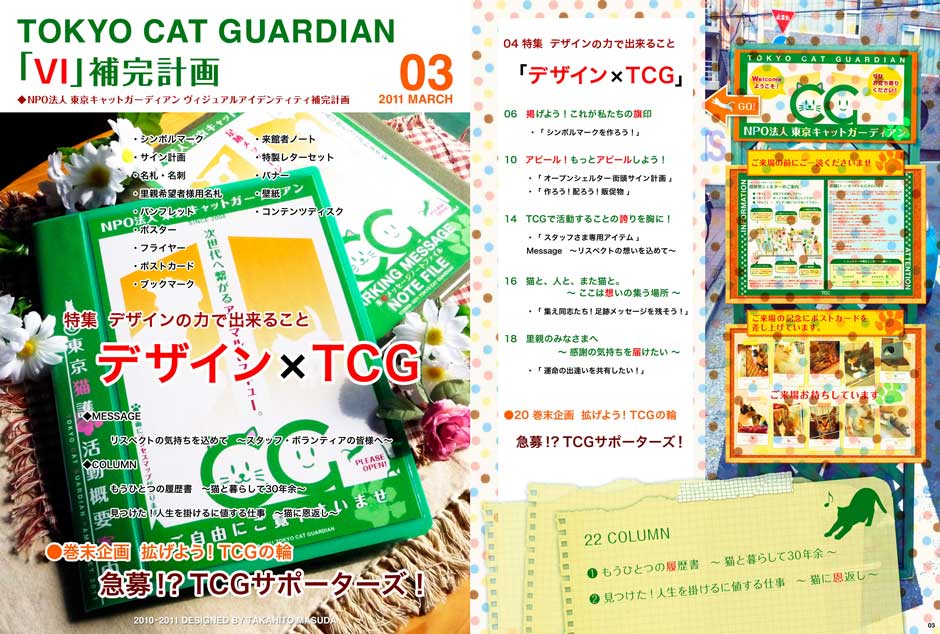 - 猫の保護活動を行っているNPO団体さまへVIのご提案をした際のプレゼンファイル。制作意図がより具体的に伝わるよう雑誌風にビジュアルを大きく、特に実際の使用イメージを演出したビジュアルを多数配置し構成しています。